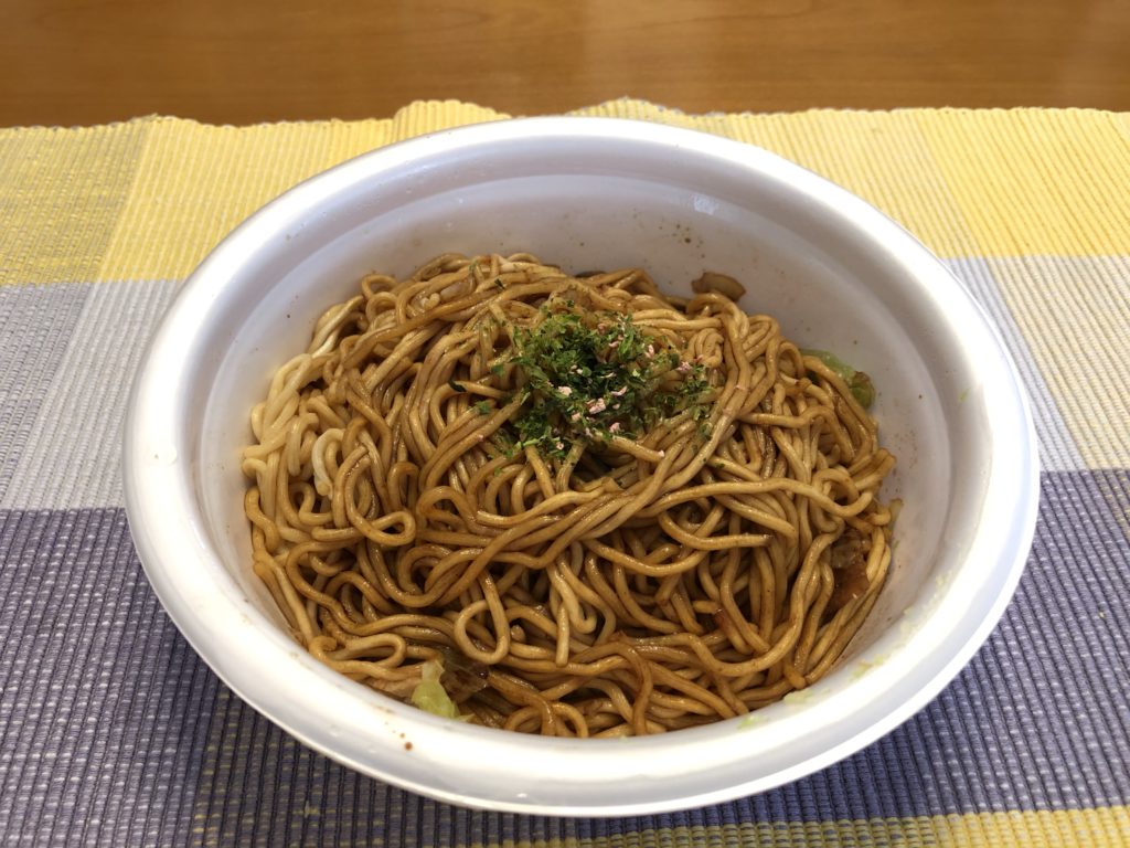 お湯を注いで3分待ち、ソースをかけてかき混ぜて、青のりを振りかける。