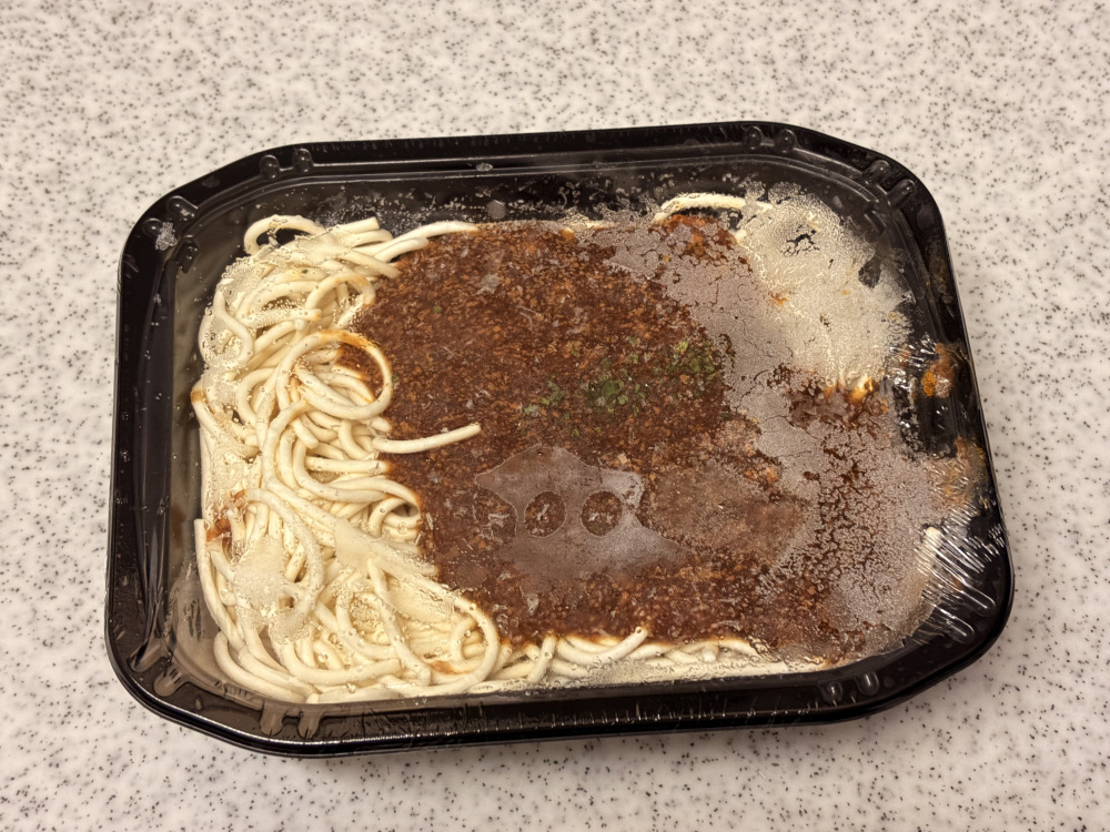 温め終わったトレイを取り出すと、ボロネーゼ特有の肉の香りと、トマトの酸味がふわりと広がります。