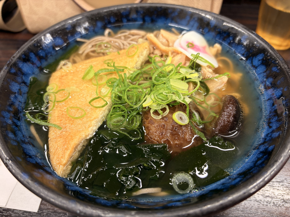 こちらは、かまぼこ、わかめ、きつね揚げ、ねぎ、しいたけなど、彩り豊かな具材がトッピングされた華やかな一杯です。