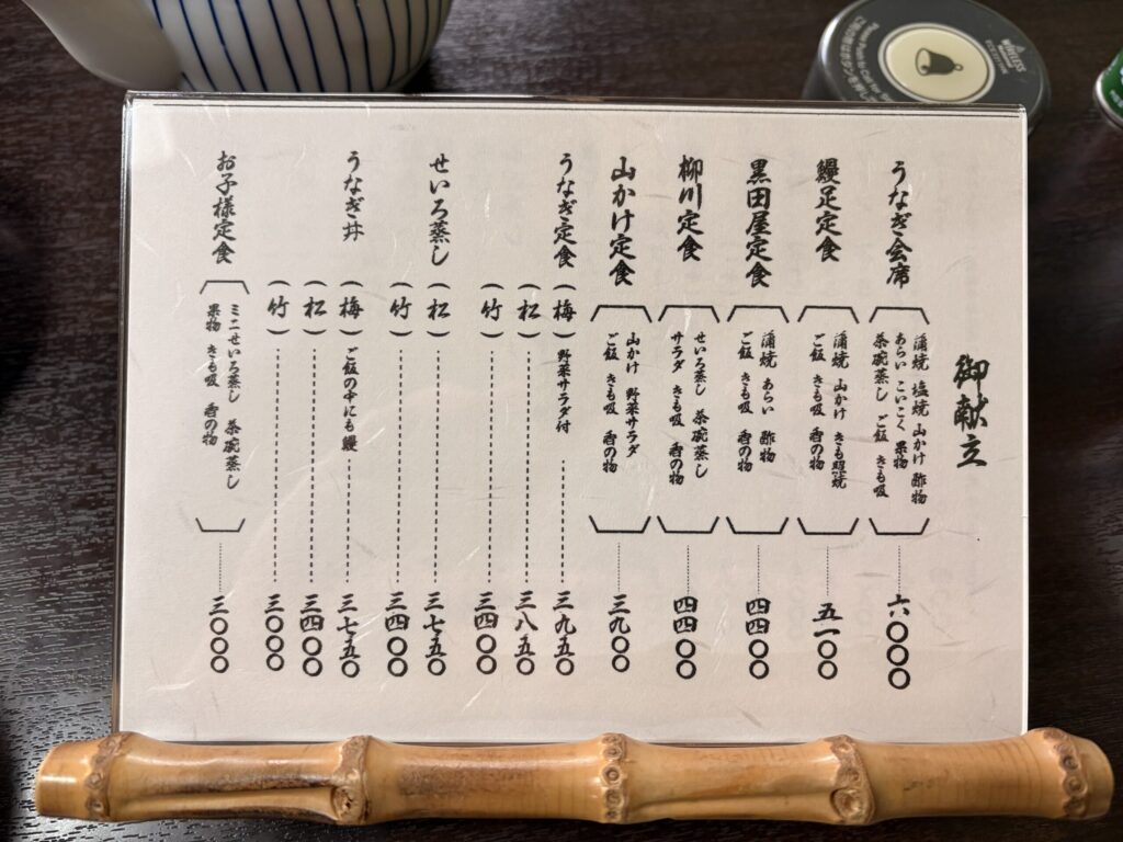 お品書きと価格帯。せいろ蒸しと鰻丼の絶妙な設定