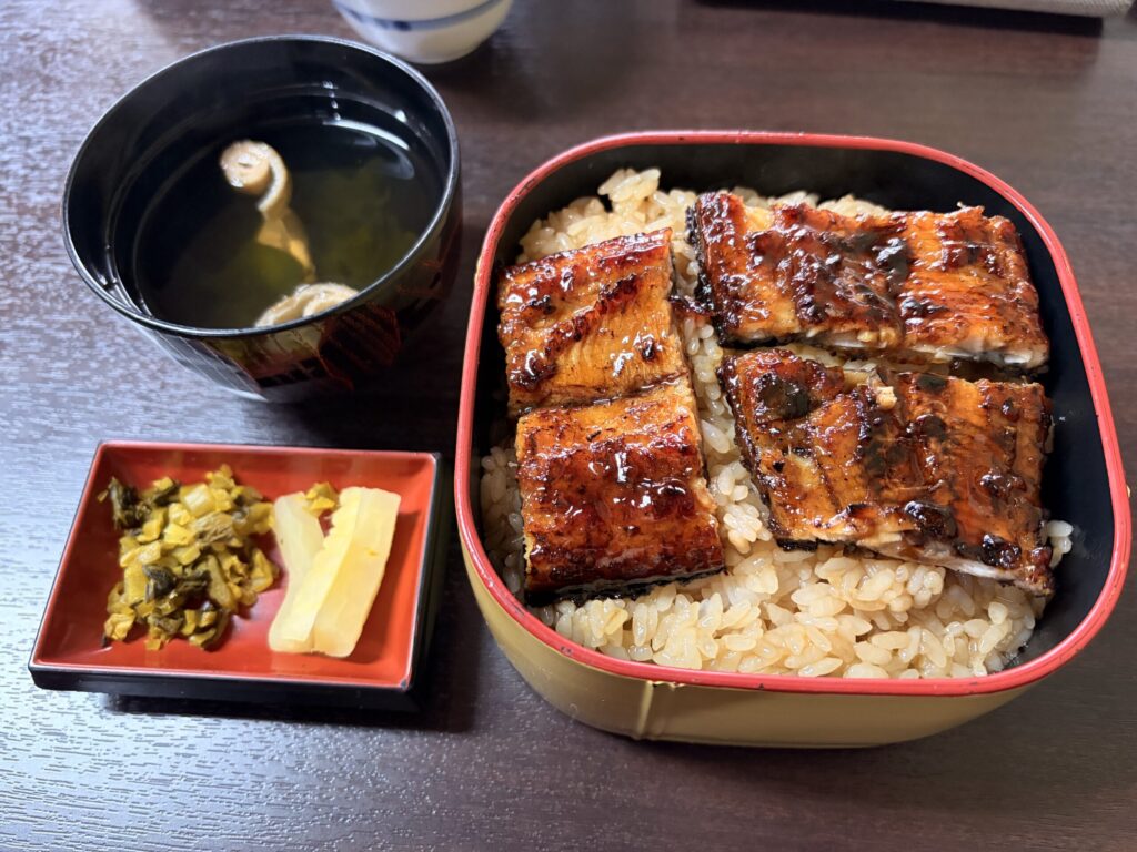 蓋をそっと持ち上げると、中からは大きなうなぎが3切れ、堂々とした姿で現れます。