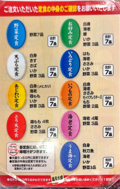 メニュー表には色分けされたボタンで、以下のような定食が用意されています。