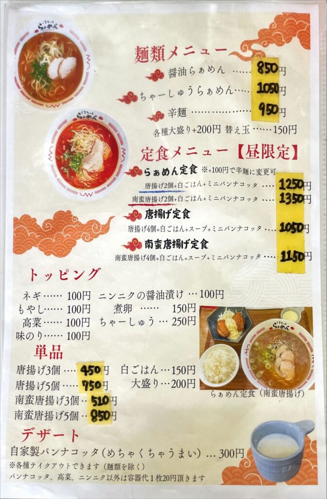メニューは、醤油らぁめんをはじめ、ちゃーしゅうらぁめん、辛麺、らぁめん定食、唐揚げ定食、南蛮唐揚げ定食など、種類が豊富です。