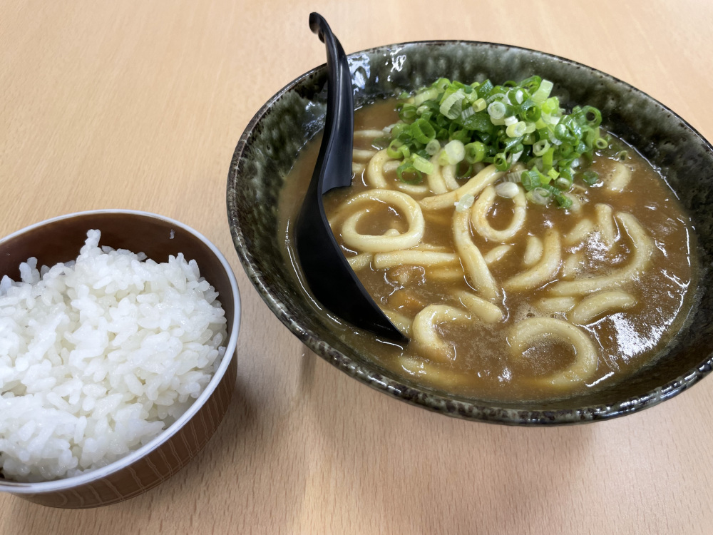 ライス付きですが、盛りは控えめで、うどんと合わせても過不足ない満腹度に収まります。