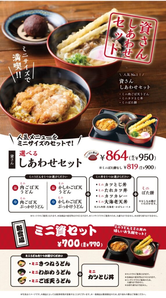 「しあわせセット」は、ミニうどん1種+ミニ丼1種+ミニぼた餅の三点構成のセットです。